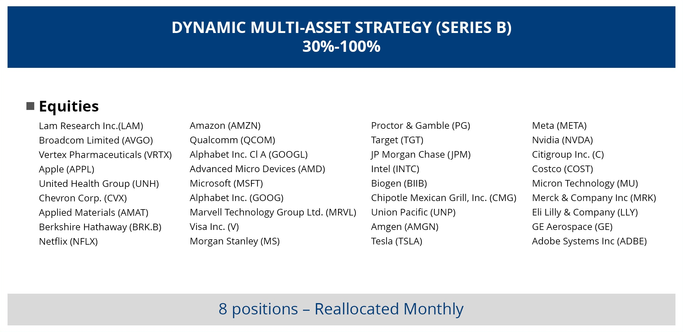 The Dynamic All Equity Strategy – Series B is an all-equity portfolio comprised of top NDX/SPX stocks by market capitalization. The model is a relative strength tactical model focuses on momentum leaders and selects from some of the most actively traded issues. Each month we select 8 candidates for an equally weighted investment portfolio and replace and reweight issues accordingly.