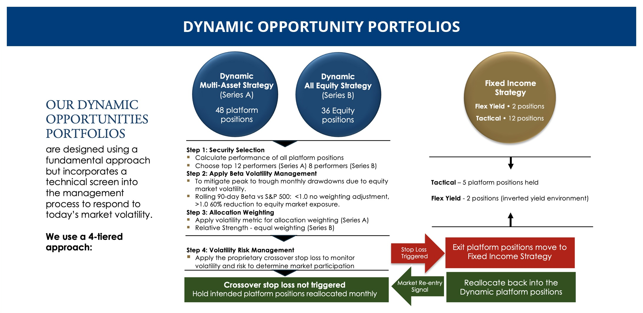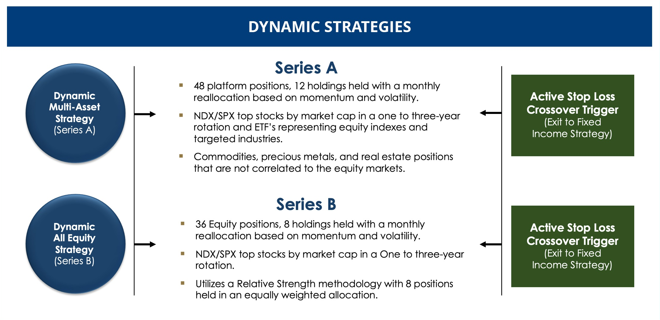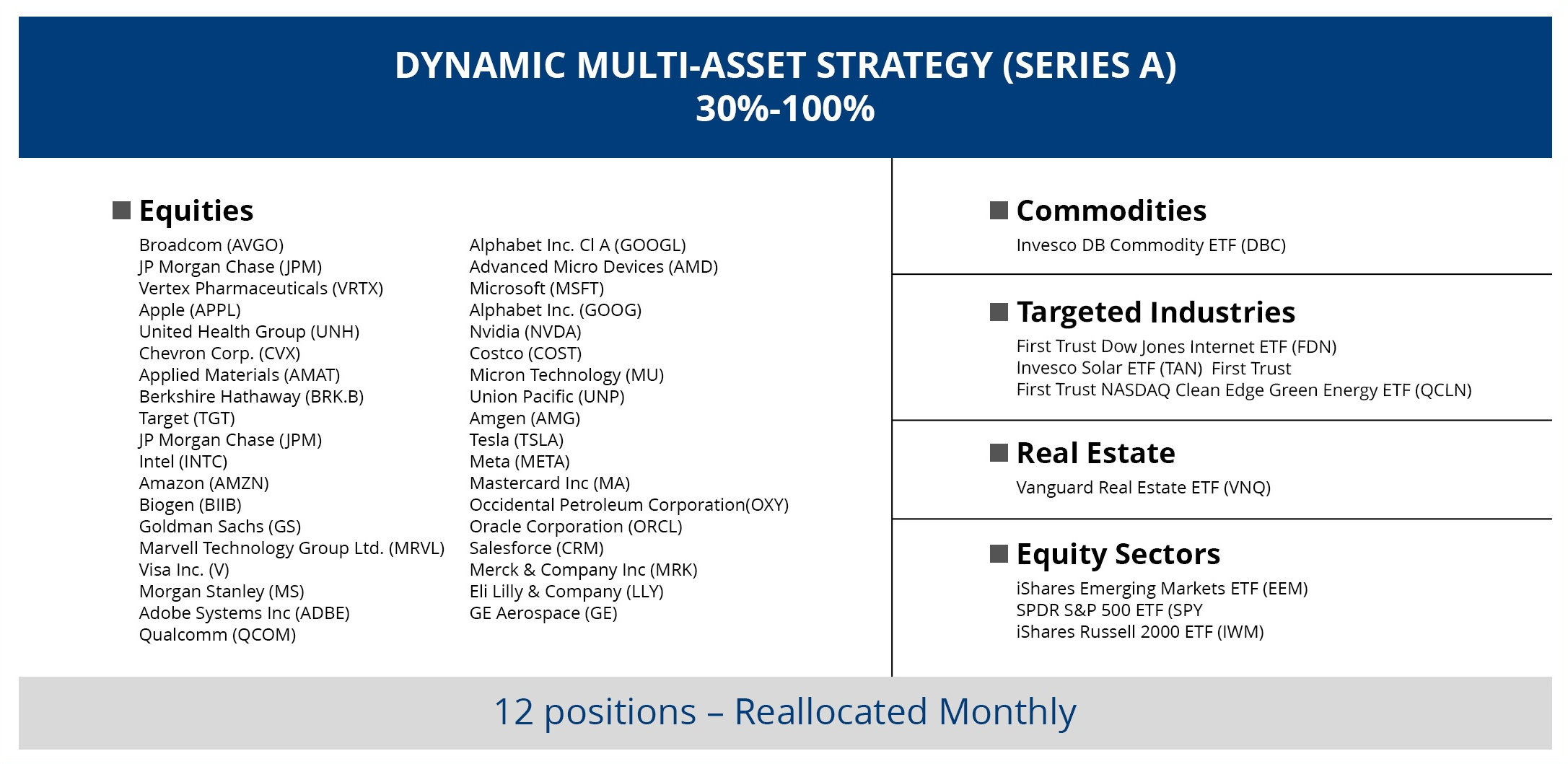 The Dynamic Multi-Asset Strategy – Series A is an adaptive allocation model designed with a focus on what we consider to be the top stocks in the Nasdaq 100 and the S&P 500. In addition, we’ve added equity index ETF’s and a layer of diversification consisting of multi-asset class ETF’s, which include commodities and precious metal positions that are not correlated to the equity markets. We run these through a proprietary tactical allocation screener each month to determine the top eight candidates for investment. We want to balance out the risk amongst the portfolio, so allocation weights vary according to each investment’s risk profile.